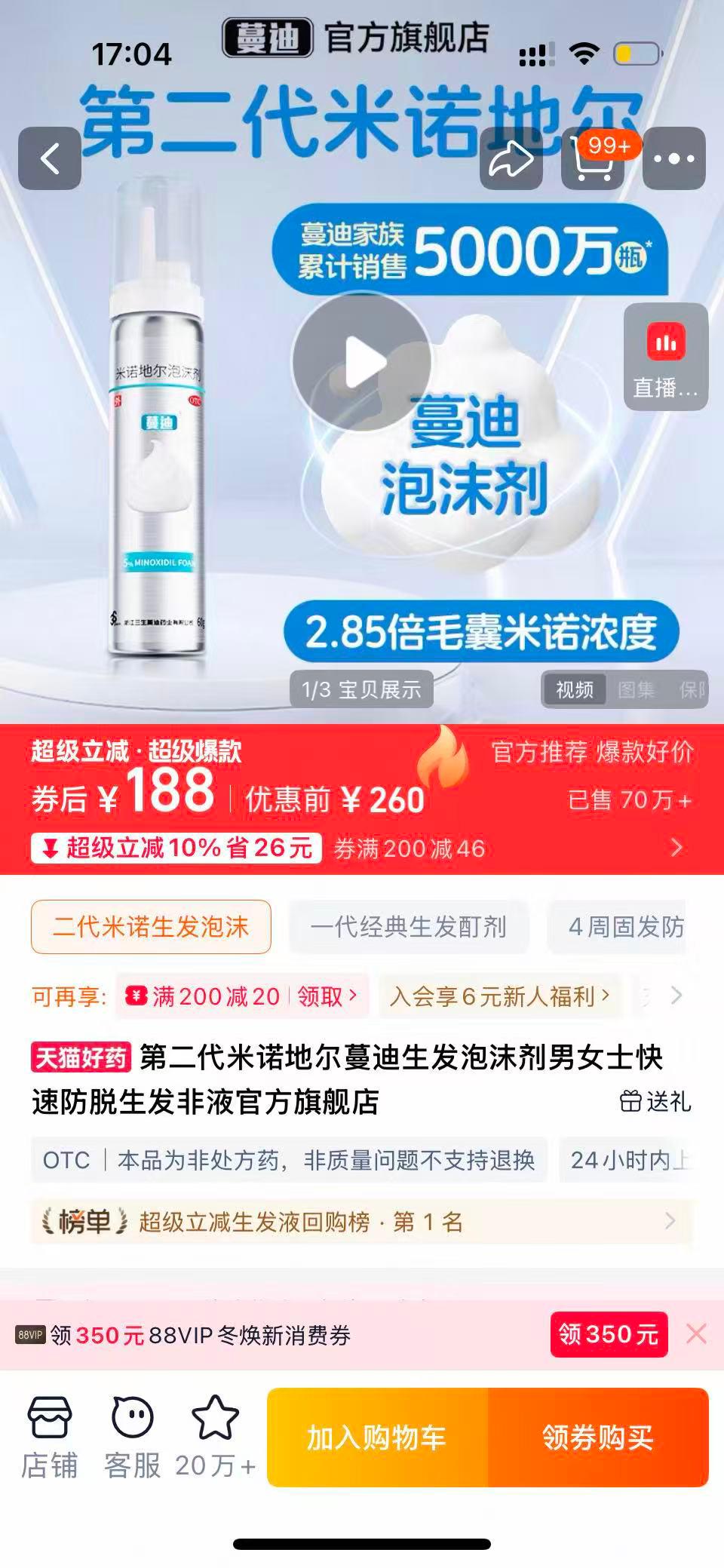 公司同时推出洗发水与防脱配套产品,以延伸品牌在轻度脱发与头皮护理领域的覆盖面。在天猫“蔓迪防脱固发洗发水”页面上,品牌将米诺地尔与中药养发概念并列呈现,产品单价超过百元,消费属性进一步凸显。