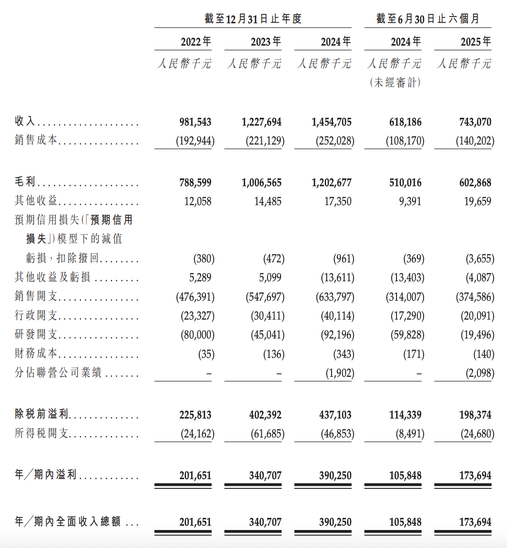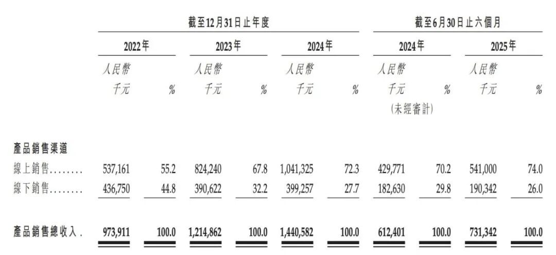 根据招股书,截至2025年中,公司内部销售与推广团队超过80人,其中90%具备数字营销背景。线上渠道的贡献在过去三年快速放大,2022年线上收入占比55.2%,2024年即提升至72.3%,电商复合增长率约40%。