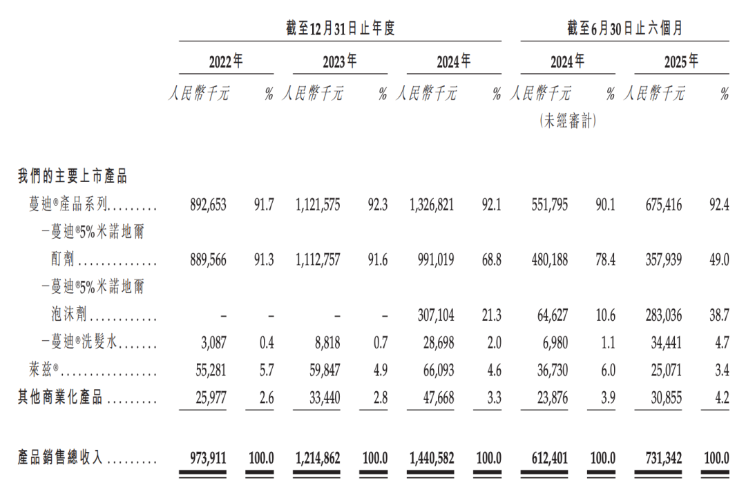 5%米诺地尔酊剂是蔓迪最早推向市场的核心品种,2022年销售额8.9亿元,占总收入91%,但到2024年占比已降至68.8%。取而代之的是泡沫剂,这一剂型在2024年收入突破3.07亿元,占比上升至21.3%。