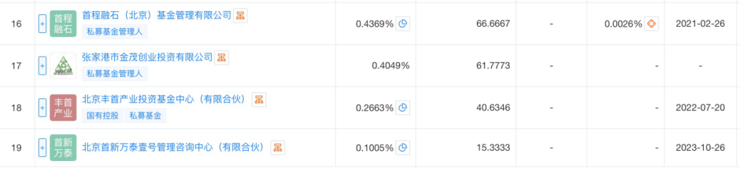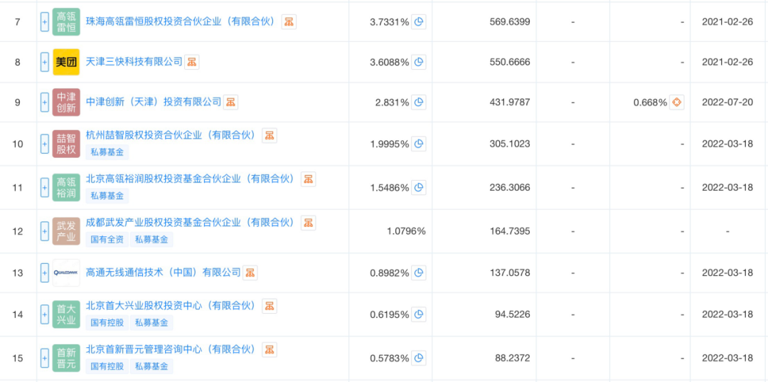 首程控股共持股8.02%,天壹资本和九智资本分别持股6.2%和6.05%。高瓴持股5.28%,美团战投和中银投资分别持股3.6%和3.5%。