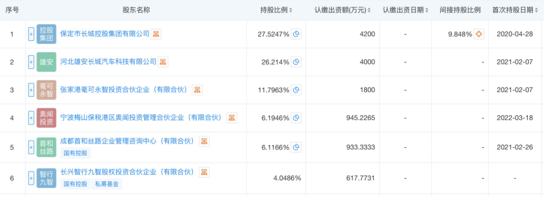 目前长城汽车仍为毫末智行的大股东,通过“保定市长城控股集团有限公司”和“河北雄安长城汽车科技有限公司”直接和间接共持股63.59%。