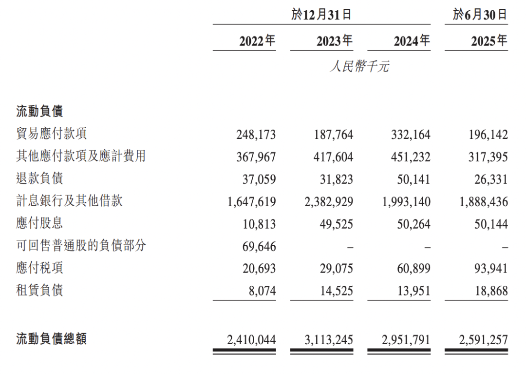 流动负债中,计息银行及其他借款占主导,2024年全年及2025年上半年分别为19.93亿元和18.88亿元,公司仍高度依赖短期融资维持运营。