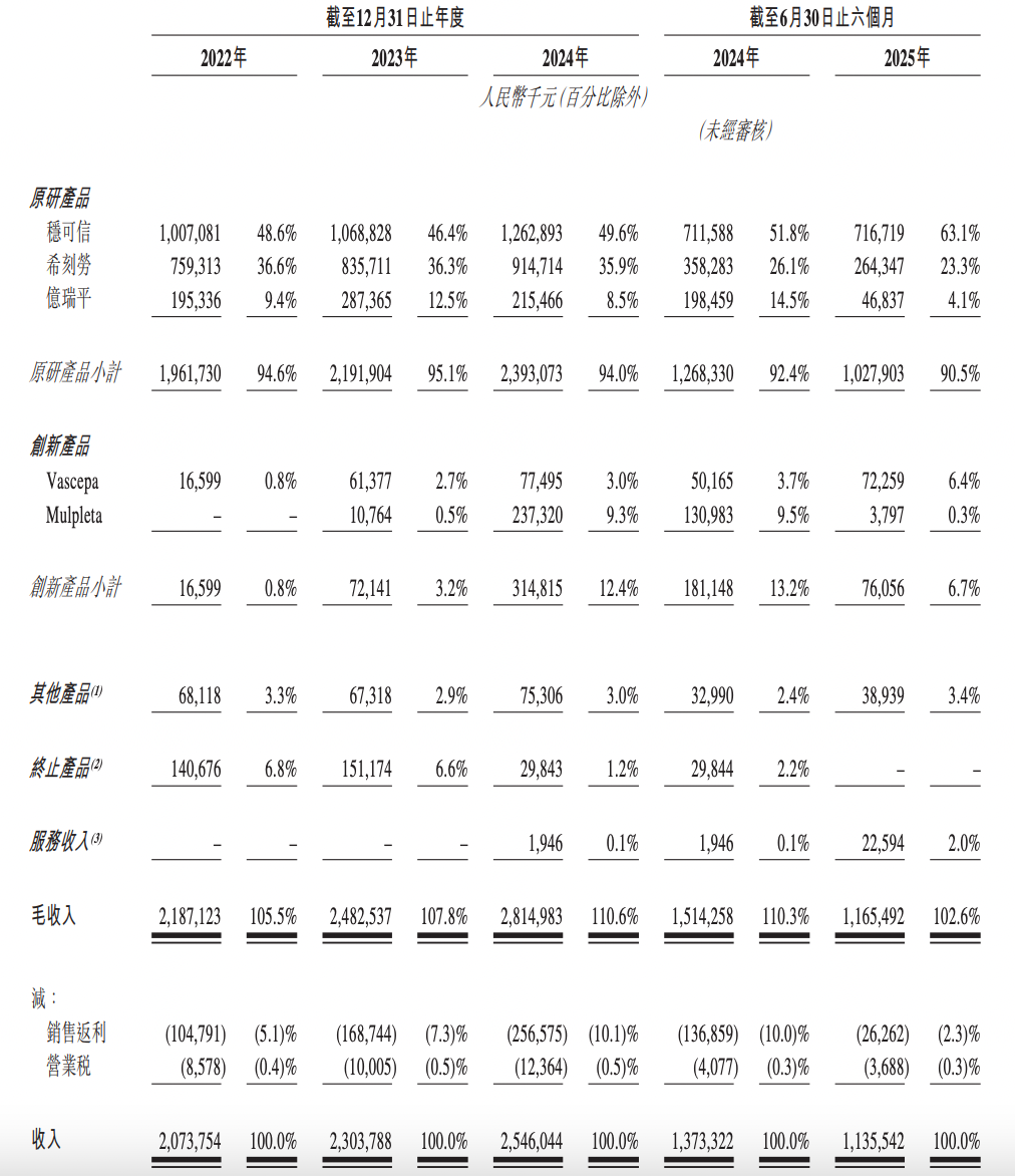 另一边,亿腾医药2022年至2024年营收规模始终没有显著增长,徘徊在20至25亿区间,目前核心产品稳可信、希刻劳、亿瑞平贡献超九成。