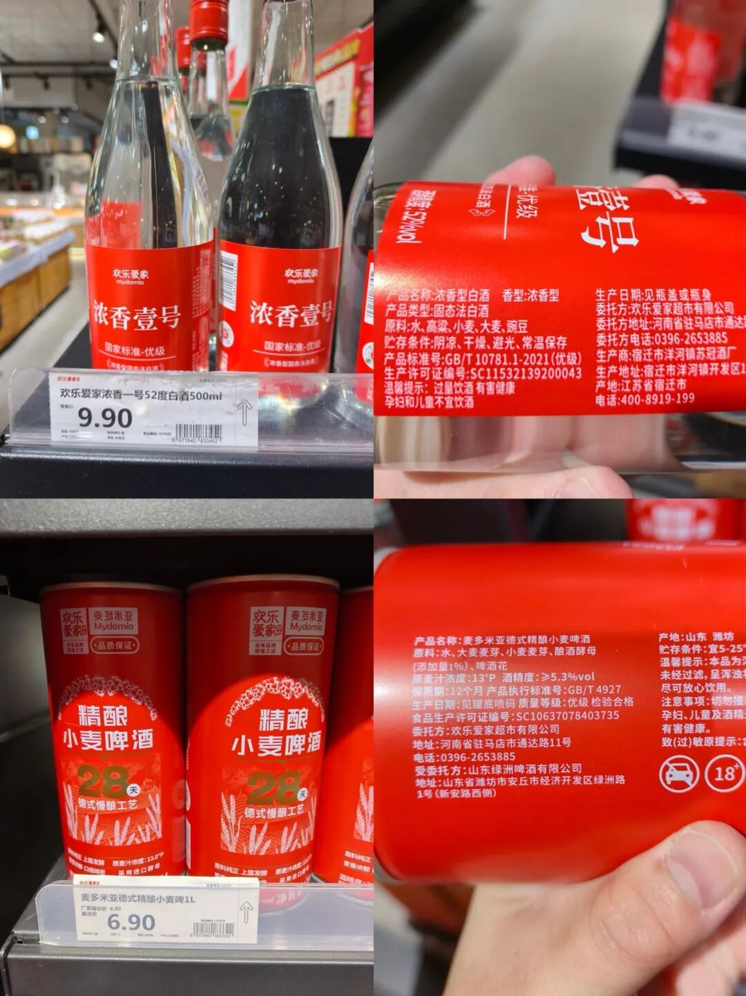 我们观察到,欢乐爱家店内“麦多米亚”的自营商品种类主要包括白酒、精酿啤酒、复合果汁、洁面巾、饮用水、无抗鲜鸡蛋等河南本地区域新商超最常见的几款品类,并且供应商大多也是业内比较常见的代工方。