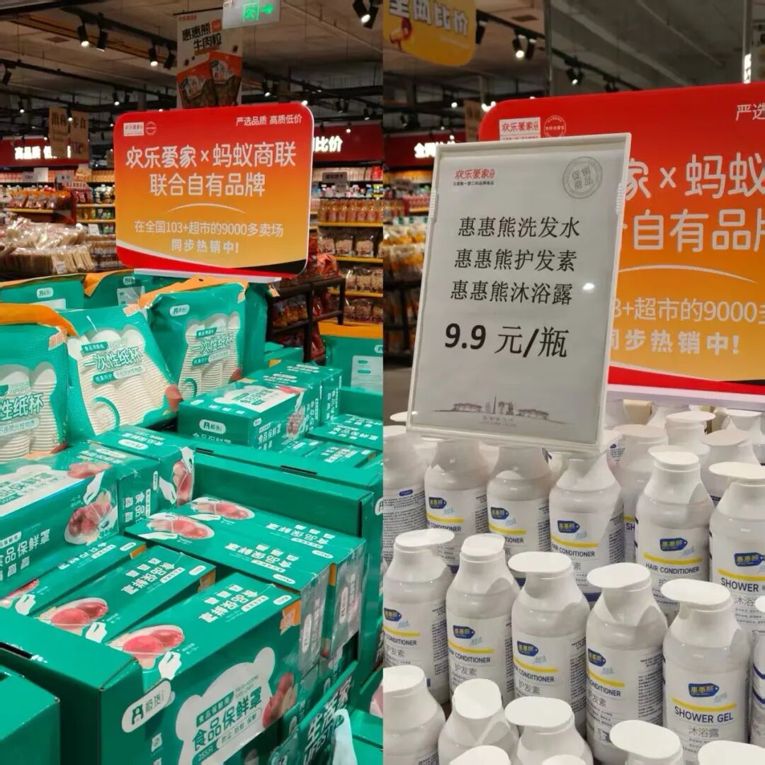 有山姆MM的商品来给商品丰富度撑腰,欢乐爱家同时还与蚂蚁商联合作引进了不少自有品牌的生活用品,包括“极货”的一次性纸杯、小苏打洗衣皂;“惠惠熊”的洗发水、沐浴露等,持续扩充商品库的多样性。
