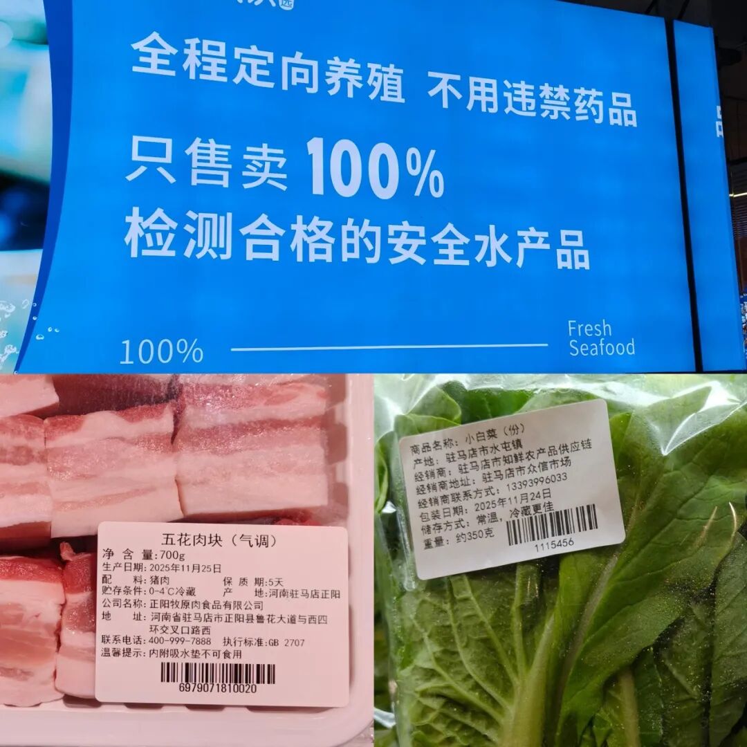 商品定价突出性价比,但这并不意味着欢乐爱家会放弃对商品品质的重视,这在超市内的各个运营细节中都有所体现,比如水产区用醒目的招牌写着:全程定向养殖、只售卖100%检测合格的安全水产品;净包装的冰鲜猪肉均来自头部企业牧原;叶菜则是当天从众信市场(本地最大的农产品交易中心)直采,确保新鲜溯源。