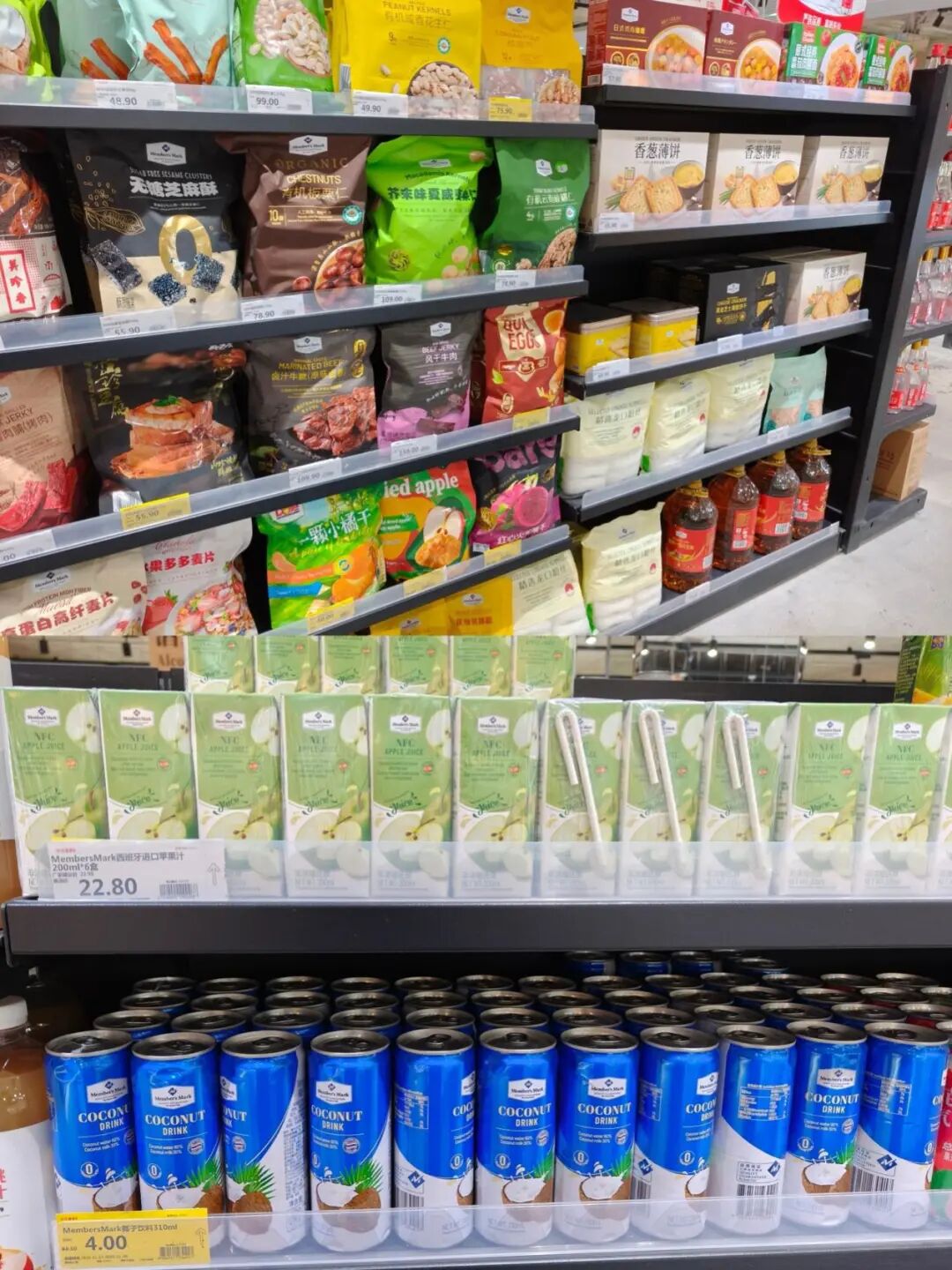 另一个值得注意的细节是,欢乐爱家店内还有专门的货架来陈列山姆MM商品,这些经过山姆代购商所引进的MM自营商品多为零食饮料品类,包括地瓜棒、板栗仁、花生仁和椰子饮料等。
