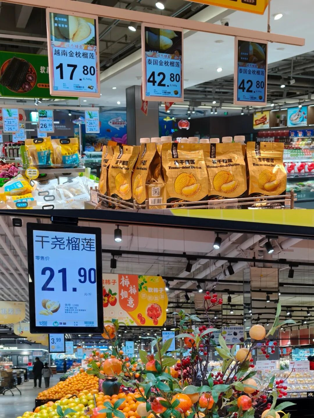 首先,同在驻马店市,欢乐爱家和喜盈门的多款商品价格都是贴身对标,种类丰富度和性价比优势不分上下。比如,笔者实探当天,两家门店的鲜活虾价格均为27.8元/500g;另外,欢乐爱家所售的越南干尧榴莲定价21.9元/500g,而喜盈门有两款榴莲在售,其中越南金枕榴莲售价17.8元/500g、泰国金枕榴莲45.8元/500g。