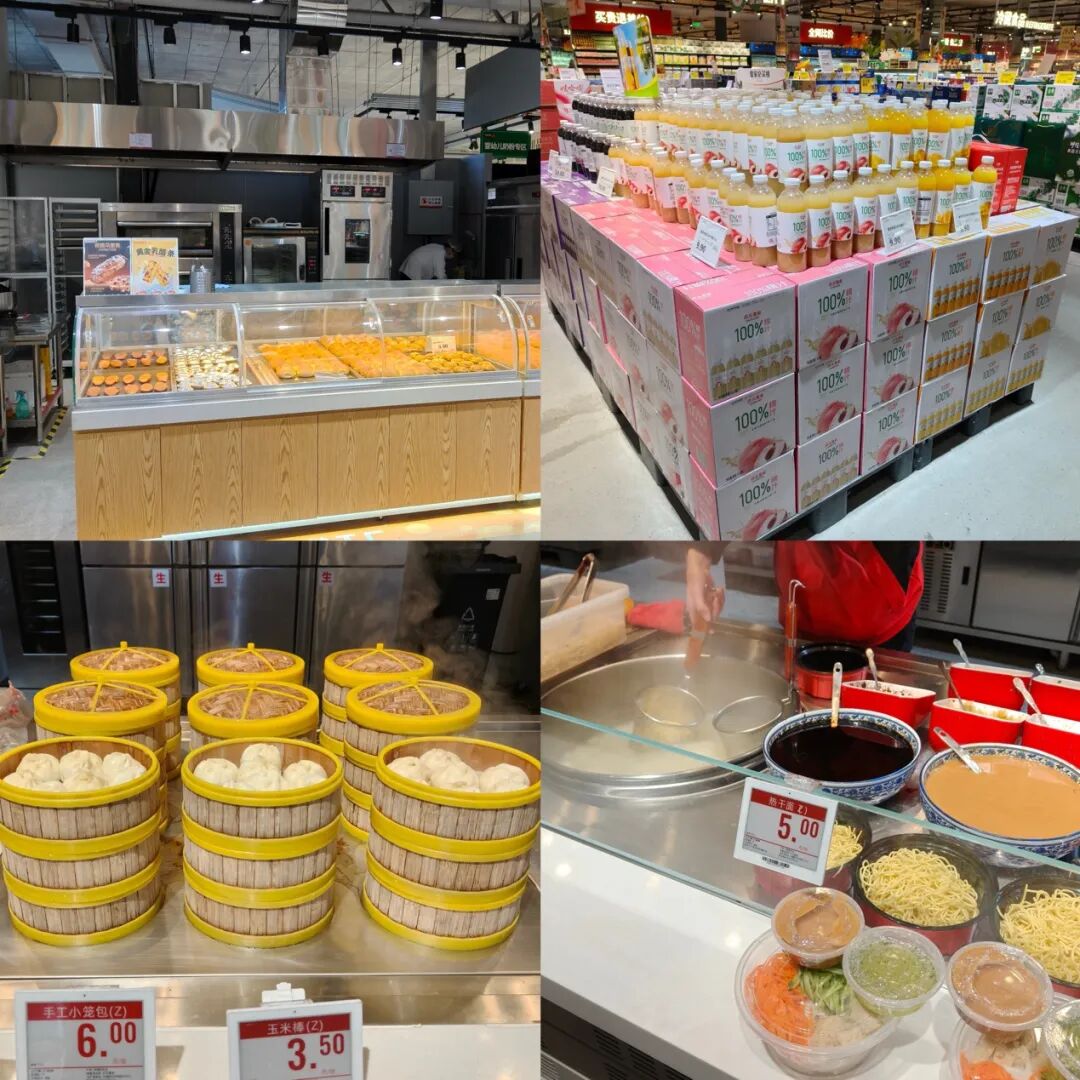 比如,超市入口一侧的自营烘焙区,采用“明厨亮灶”模式打造烤制操作间,制作过程全程可视化;紧邻烘焙区的是复合果汁、精酿啤酒、白酒等自营商品的大型堆头,强化核心品类曝光;深入店内的熟食鲜食加工区,热干面、馄饨、米线等现制美食实时供应,肉眼可见的新鲜度与烟火气,正是“餐超”模式的核心亮点。
