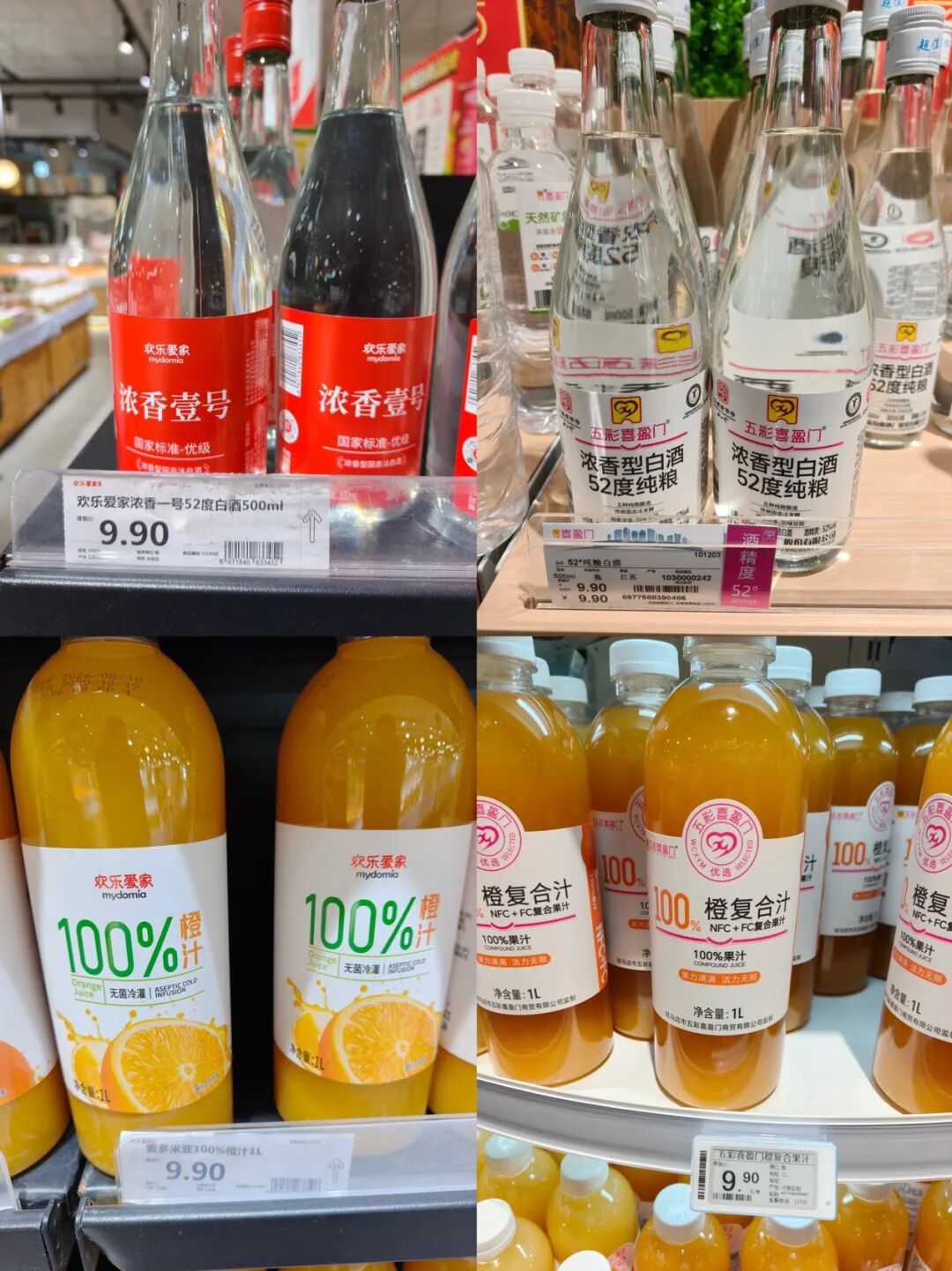 在自营商品领域,两家的价格同样“齐头并进”:1L装复合果汁均售9.9元,500ml装52度纯粮浓香型白酒也统一标价9.9元,性价比竞争进入白热化阶段。