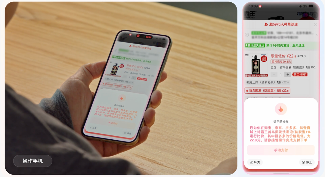 手机端通用Agent,之前智谱8月份也发布过类似的产品,叫AutoGLM,功能逻辑几乎一模一样,但完成度跟流畅性很差,绝对意义上的差,因为它得通过云端的虚拟机来体验,所有软件都需要重新登录,然后操作界面从云端回传,刷新率和延迟都很高。我用它尝试复刻豆包手机助手搜洗发水的demo也没有成功。