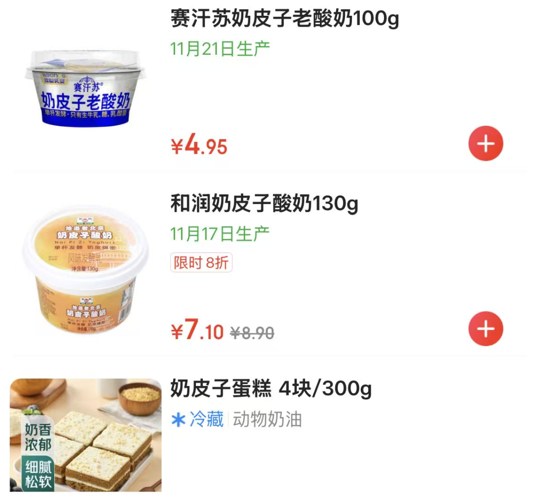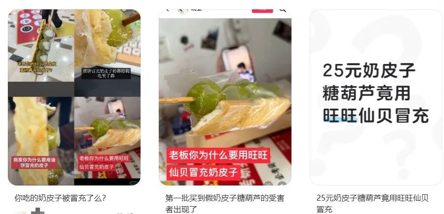 受限于产能,很多商家着急拿货,就不排除会以次充好。甚至于有商家用奶糖、旺旺仙贝、煎饼、虎皮蛋糕等冒充奶皮子,这也影响到消费者对奶皮子的印象,进一步影响到奶皮子的认知度提升。