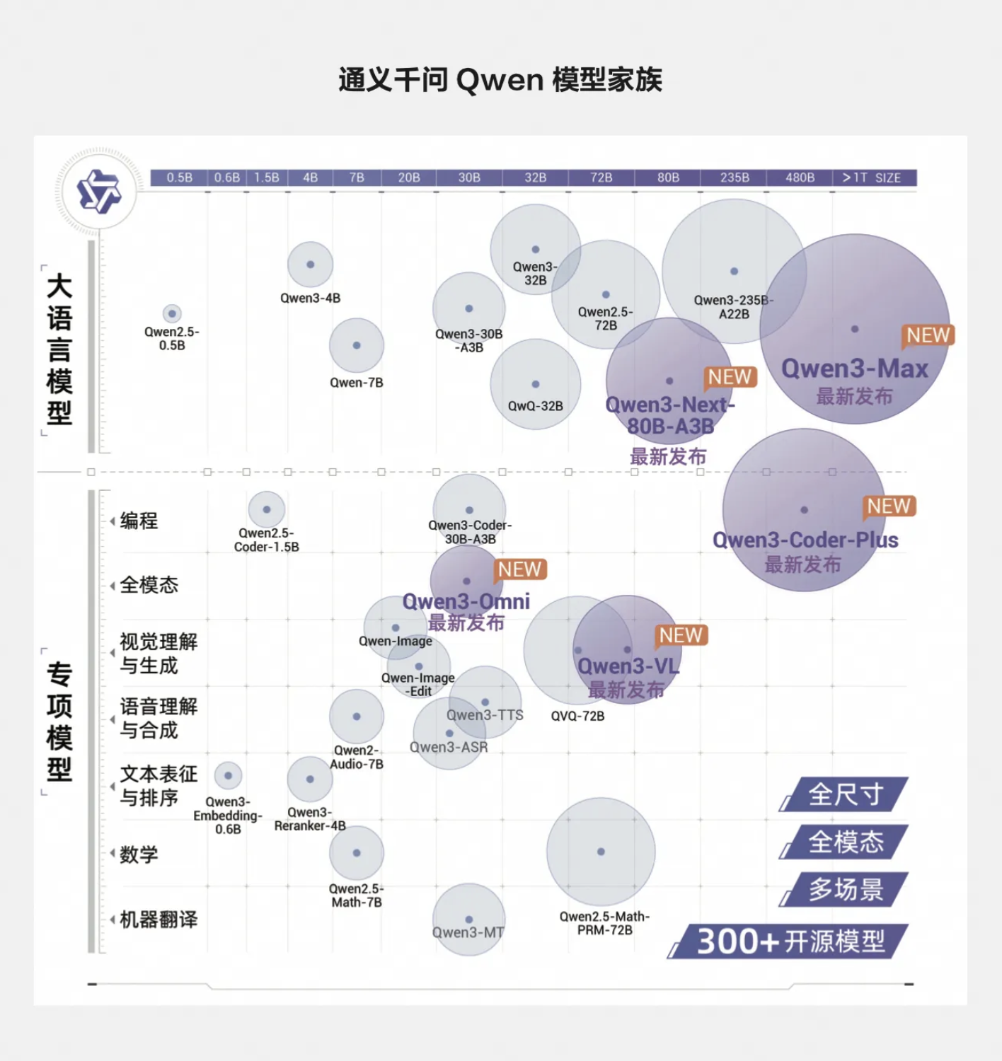 在“大模型是下一代的操作系统”的判断下,通义大模型家族继续发力,在云栖大会上“七连发”:不仅公布了 6 款模型上新,还有 1 个全新品牌发布,覆盖文本、视觉、语音、视频、代码、图像全场景,在模型智能水平、Agent 工具调用、Coding 能力、深度推理、多模态乃至模型架构等方面实现全面突破。