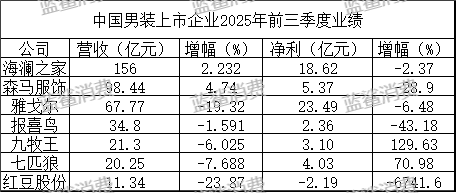男装消费市场也下滑严重。从2025年前三季度财报来看,知名男装上市公司中,仅有海澜之家和森马服饰营收增长,增幅分别为2.2%和4.7%;大多数男装上市公司“增收不增利”,仅有九牧王和七匹狼净利同比增长。