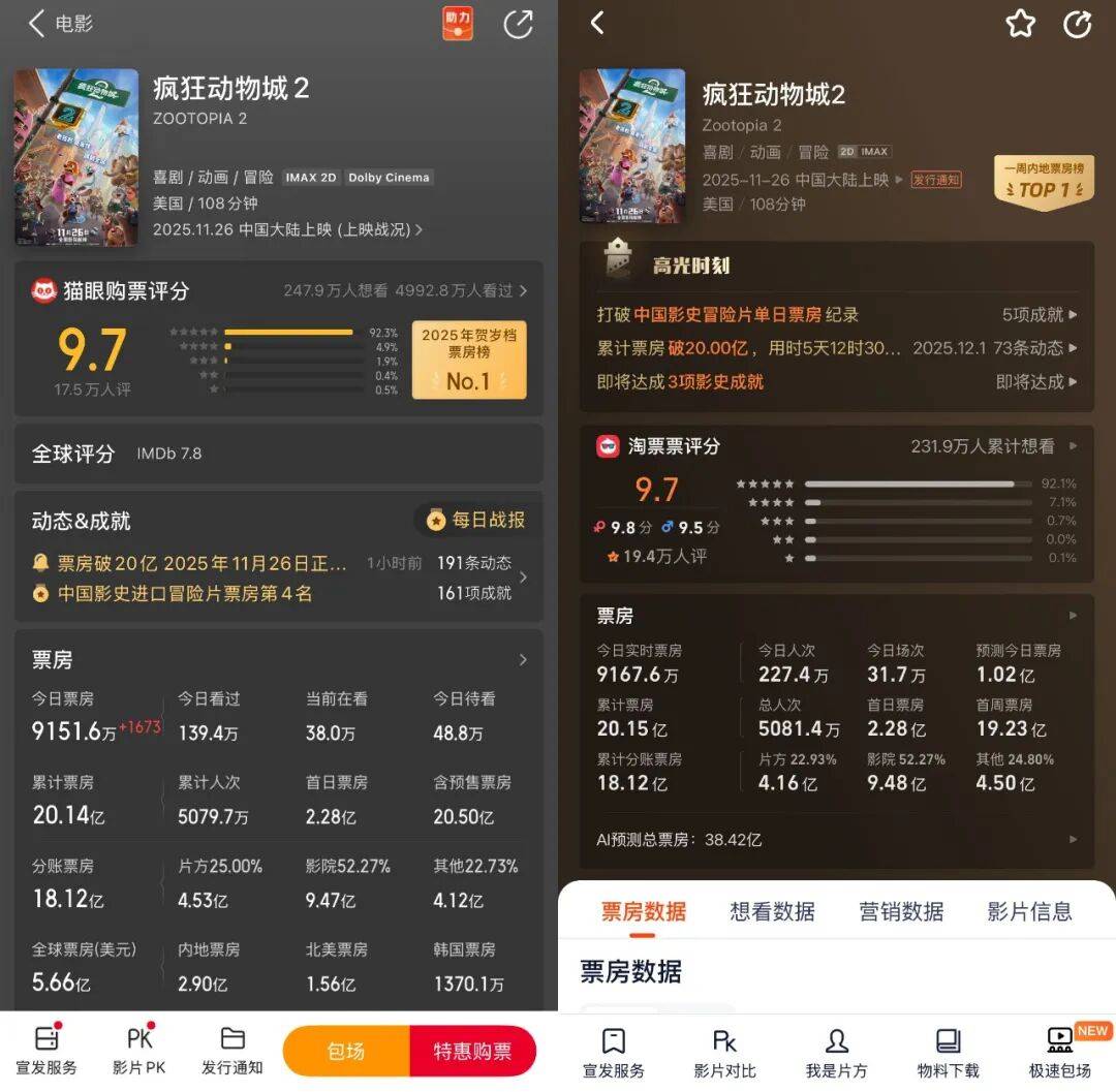 就在行业为年度500亿担忧时,殊不知《疯狂动物城2》硬是凭借一己之力给予市场托底。截至目前,全年累计票房已经来到了483亿 的位置,距离500亿仅剩不足17亿的差距,而《疯狂动物城2》的市场余量也远不止17亿,这意味着年度500亿的话题已经彻底翻篇了。接下来看看《疯狂动物城2》上映以来的疯狂表现。