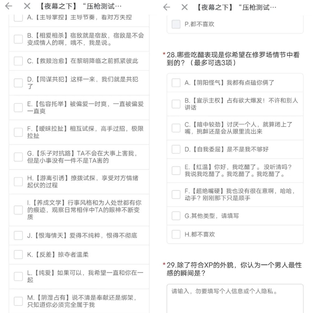 而在测试问卷调查的选项中,也出现了“骨科”“男鬼”“疯批”“覆面系”“抖S”等相对小众的人物设定和偏好,可以想见虽然目前游戏中还未出现这些设定,但制作组确实已经在考虑做出更大的突破,也需要通过更多市场数据来判断。
