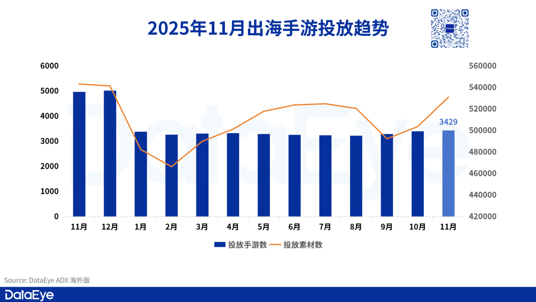 DataEye-ADX海外版数据显示:2025年11月中国大陆出海投放的手游数达到3429款,为今年以来的单月新高;出海投放的广告素材数同样有着5.4%的环比涨幅,总计超过53万组。