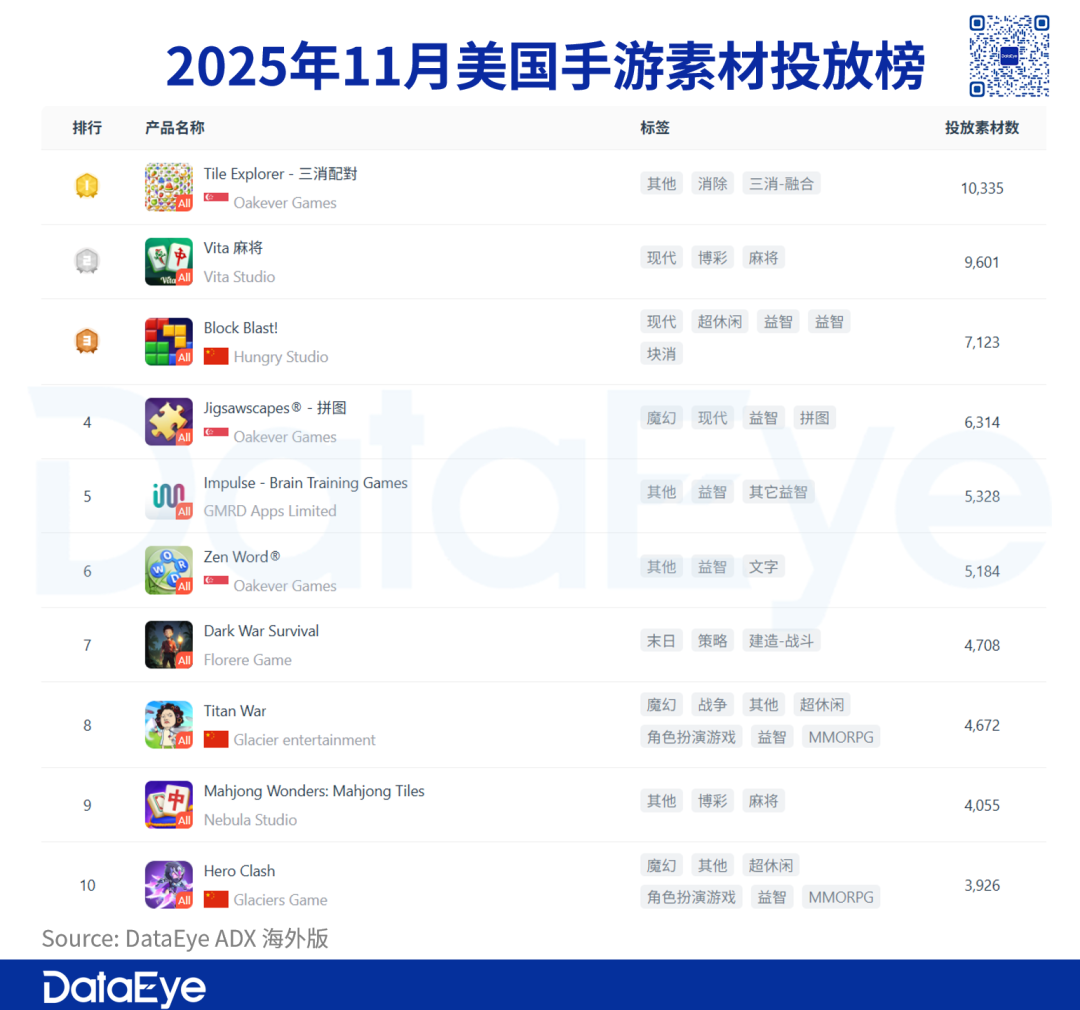 Hungry Studio的《Block Blast!》稳居第四,而冰川网络则有三款游戏上榜,并以美国市场为主要投放目的地。本月挤进Top 10的《Mahjong Wonders™》则是又一款麻将接龙游戏,游戏从7月份开启投放,在11月单月投放了8700组素材。