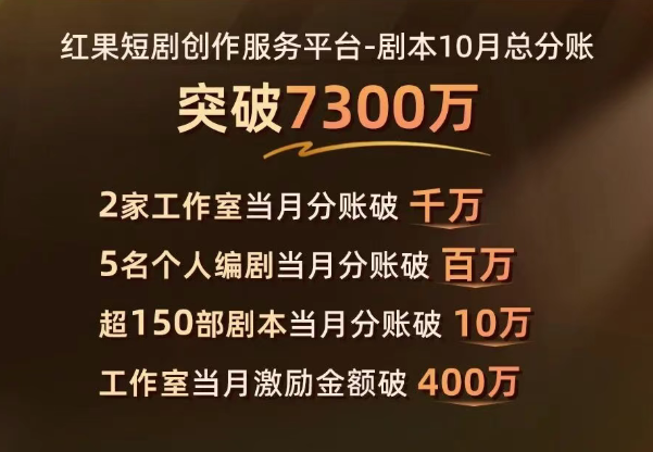 而平台也已经连续三个月发布剧本分账报告,从8月份总分账5000万到9月份的6600万再到10月份的7300万,越来越多优秀的编剧工作室及个人创作者脱颖而出获得高额分账,足以证明红果的分账机制确实吸纳了相当一部分优秀创作者,为短剧行业输出了大量优质剧本。