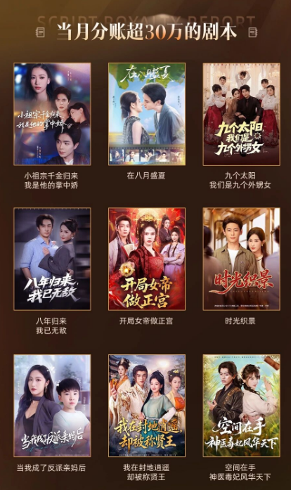 一系列骄人的数据反映出平台在剧本创作孵化取得的阶段性成果,而具体到获得高额分账的剧本,红果短剧也选择了部分进行展示。