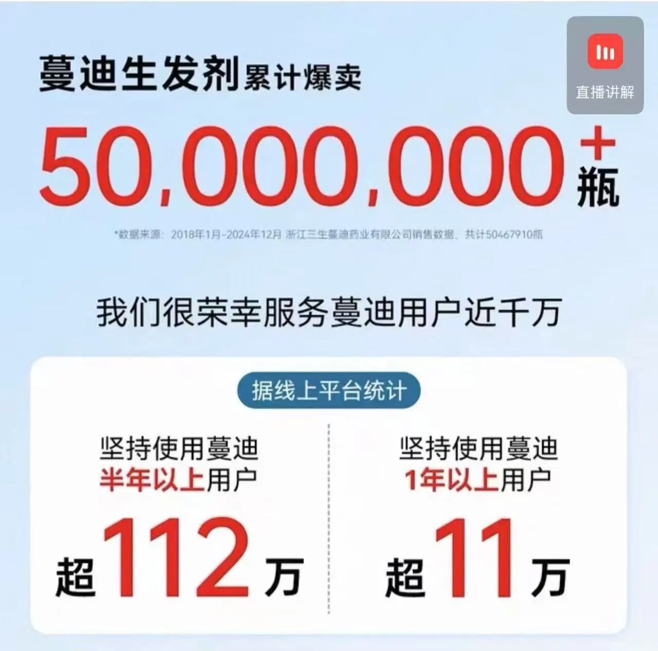 生发是一个以月甚至年为单位的缓慢过程,但当代消费者的耐心却越来越有限。如果短期看不到效果,可能就有部分人放弃。例如,蔓迪官方旗舰店的数据显示,坚持使用蔓迪半年以上的用户超112万,坚持一年以上的用户超11万人。