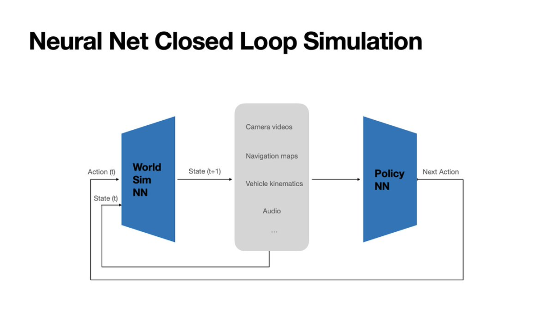 Elluswamy此次分享给出了关键信息:系统以视频为主的多模态输入进入端到端模型,直接输出控制指令,感知 - 预测 - 决策 - 控制在同一神经网络中耦合回传;这一整体框架与近期热议的“世界模型”思想高度相似。同时,在仿真侧,世界模型被用于生成对抗性场景,以实现闭环评测与迭代。