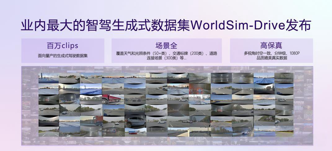 在数据规模和效率方面,WorldSim‑Drive数据集包含超过100万段生成式驾驶片段,覆盖50多种天气与光照条件、200类交通标识和300种道路连接场景,是迄今最大的自动驾驶生成数据集之一。这些合成数据保持多视角时空一致性,时长可达数分钟,画质与真实数据一致。开悟的日生产能力仅用一块A100 GPU就相当于10辆真实车辆或100台道路测试车辆的数据采集能力。目前,绝影已有20%的训练数据来自世界模型生成。