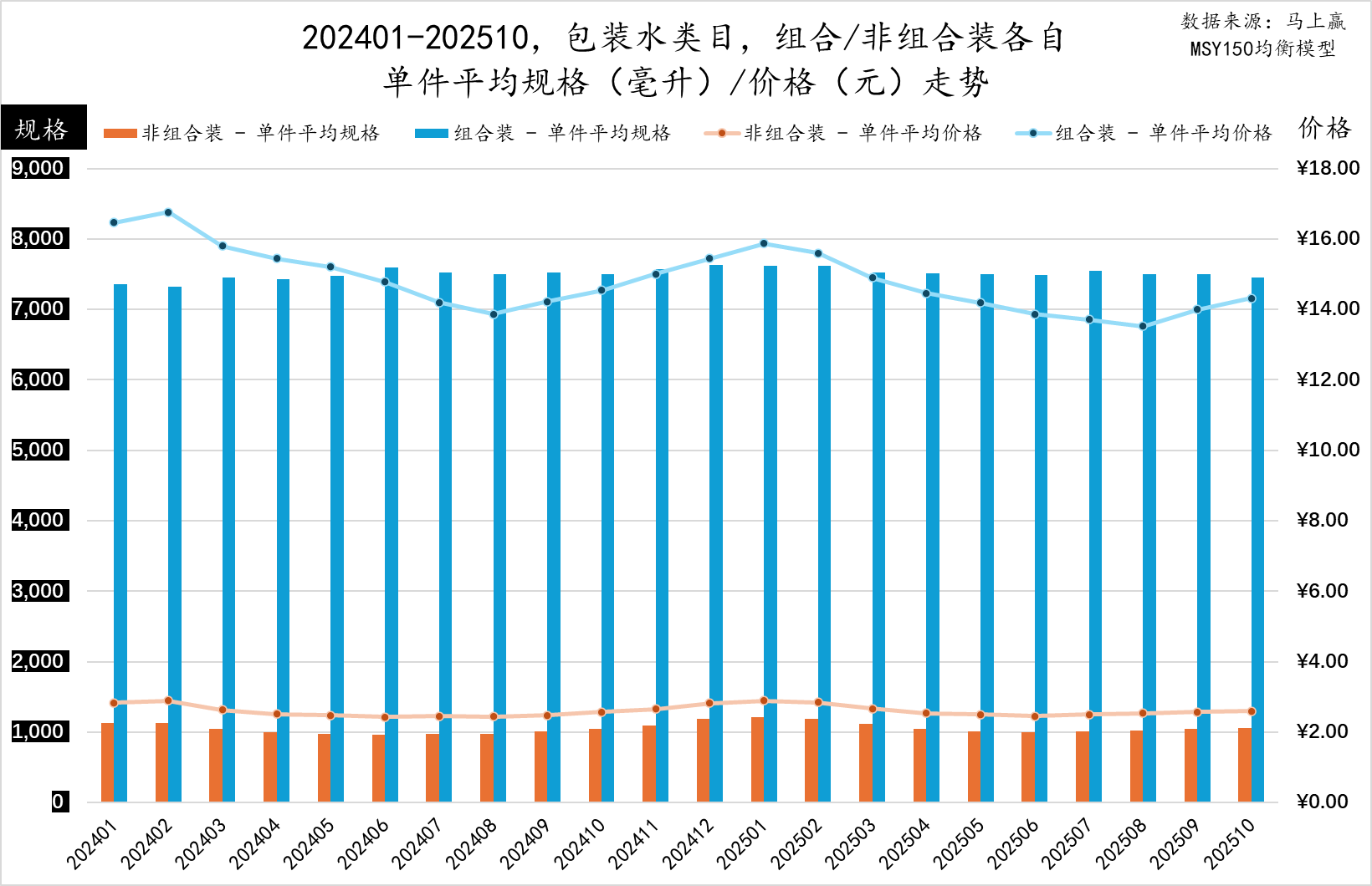 基于类目整体的产品情况,我们将组合装/非组合装分开来看其规格、件均价以及百毫升均价变化。
