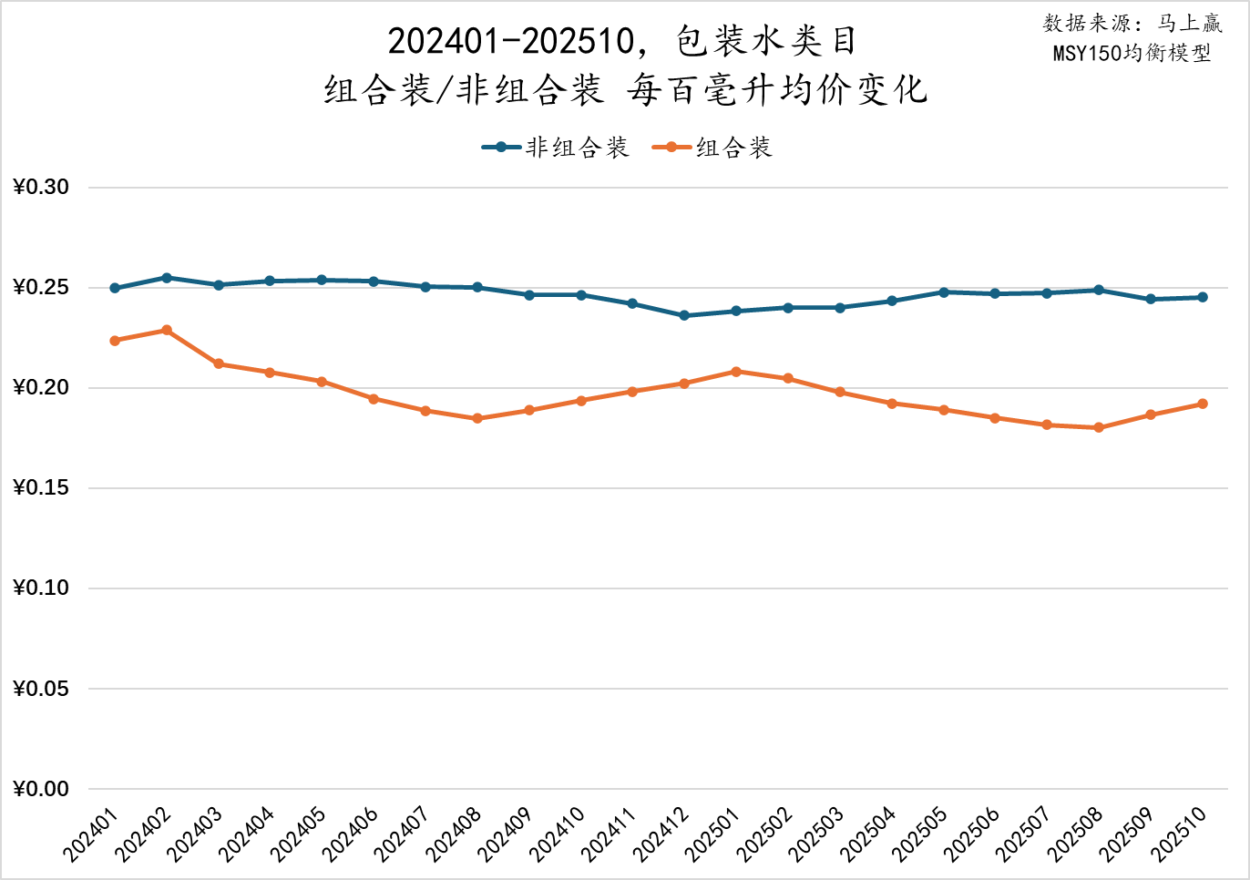 从2024年到2025年,包装水组合装和非组合装的每件平均规格在整体饮料类目大包装化的背景下保持相对稳定,并未显著增长。目前非组合装包装水的平均规格已达到1000ml/pcs,已经大幅高于饮料的单件平均规格。相比来说,组合装产品的规格在7000ml~8000ml之间波动,波动幅度稍大于非组合装产品。