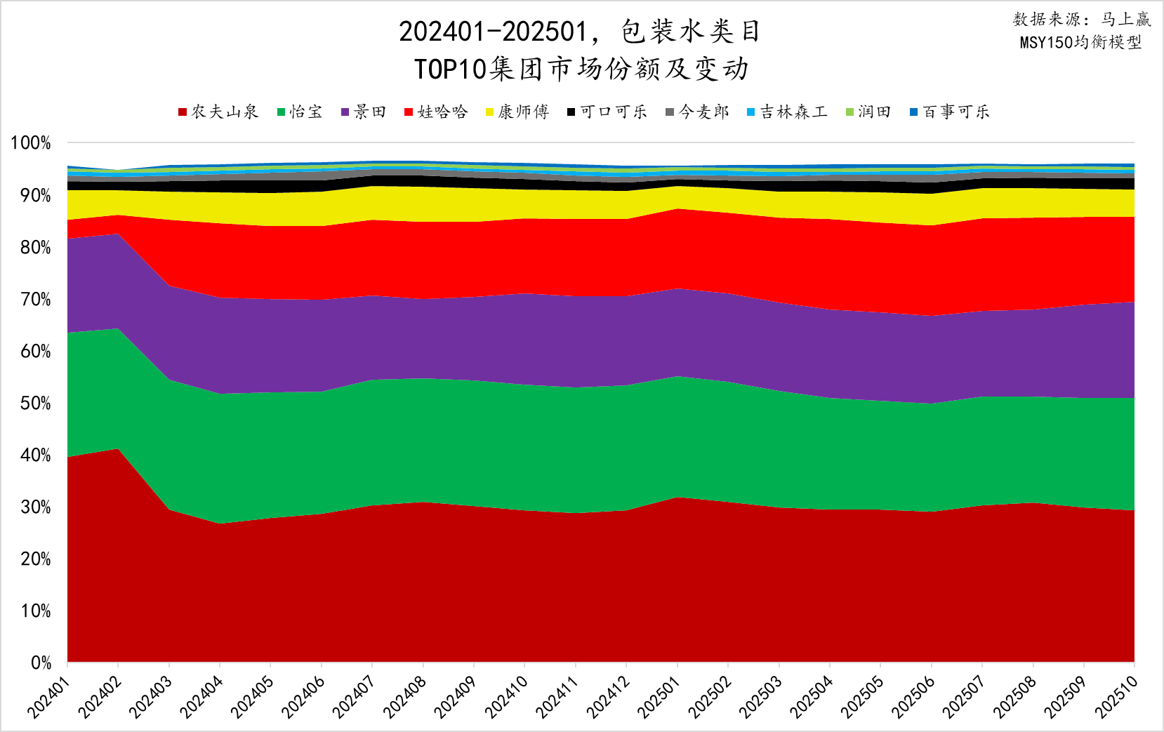 将时间拉长到2024年以来,纵观整个事件对包装水类目TOP10集团市场份额影响的全貌: