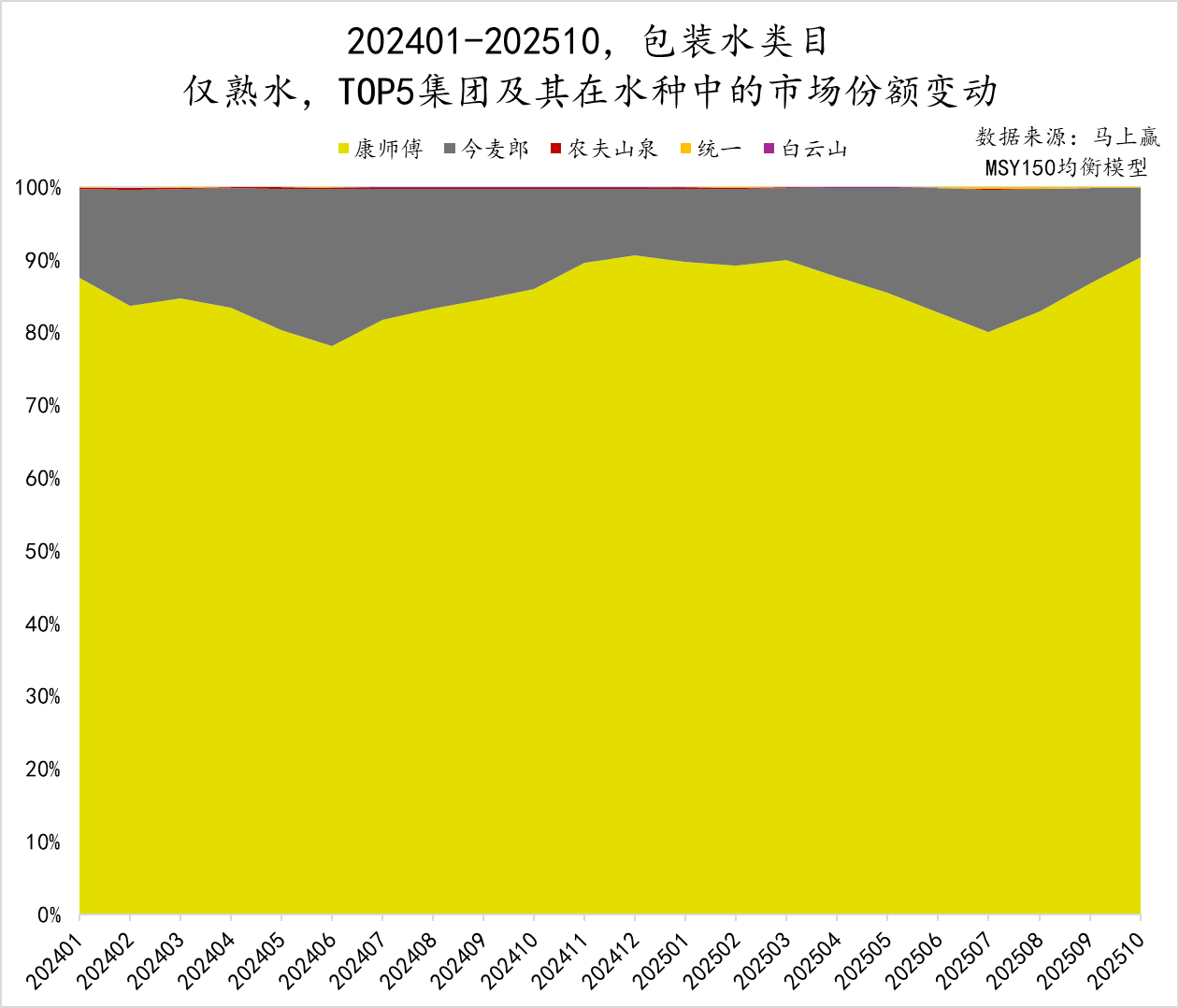 熟水赛道的竞争者相对较少,主要由今麦郎和康师傅两家公司主导,两者合计几乎占据了整个类目的全部市场份额,康师傅的市场份额约为85%,今麦郎则超过了10%。值得注意的是,在每年的包装水旺季,今麦郎在熟水类目中的市场份额会出现一年中的峰值,或许与集团的市场、促销策略相关。