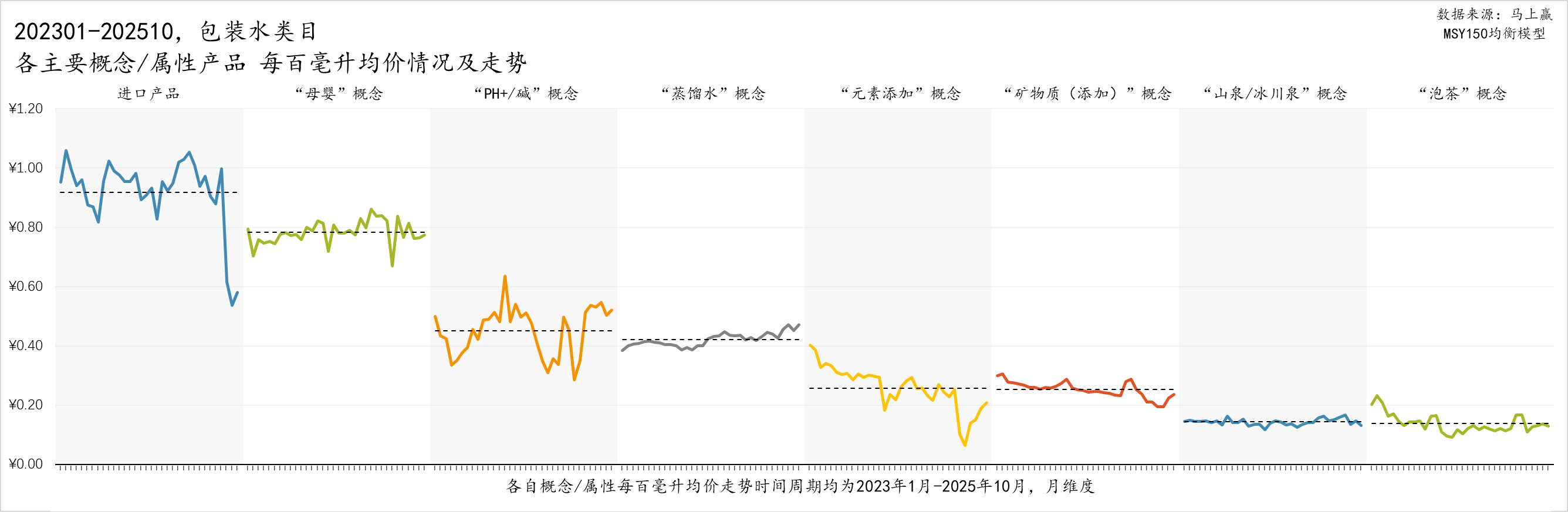进一步来看,不同饮用水概念/来源的价格走势存在显著差异。受限于运费、关税等原因,进口产品的价格远高于其他概念,达到了约0.9元每百毫升,但在近期出现了较为显著的下滑;其次是“母婴”概念的水产品,体现了其在市场中的高端定位和细分人群的附加值;“PH /碱”概念、“蒸馏水”概念的产品其每百毫升均价也高于包装水类目每百毫升均价约30%,体现了有益添加、不同工艺的溢价能力;“元素添加”、“矿物质(添加)”、“山泉/冰川泉”、“泡茶”百年水产品则没有太多溢价,甚至部分略低于包装水每百毫升均价。