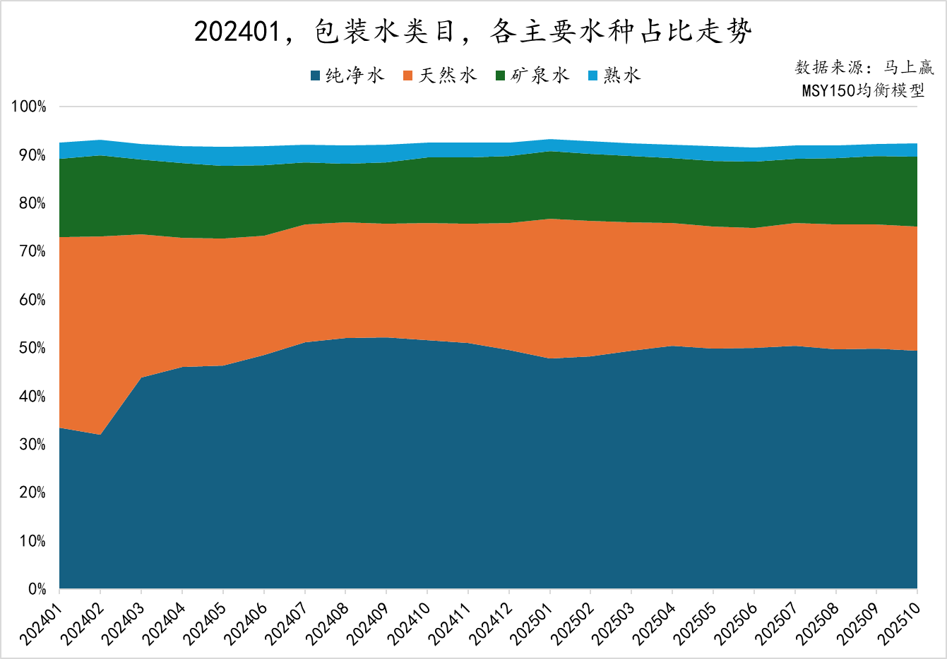 首先来看几个主要水种在包装水类目的占比情况变化。