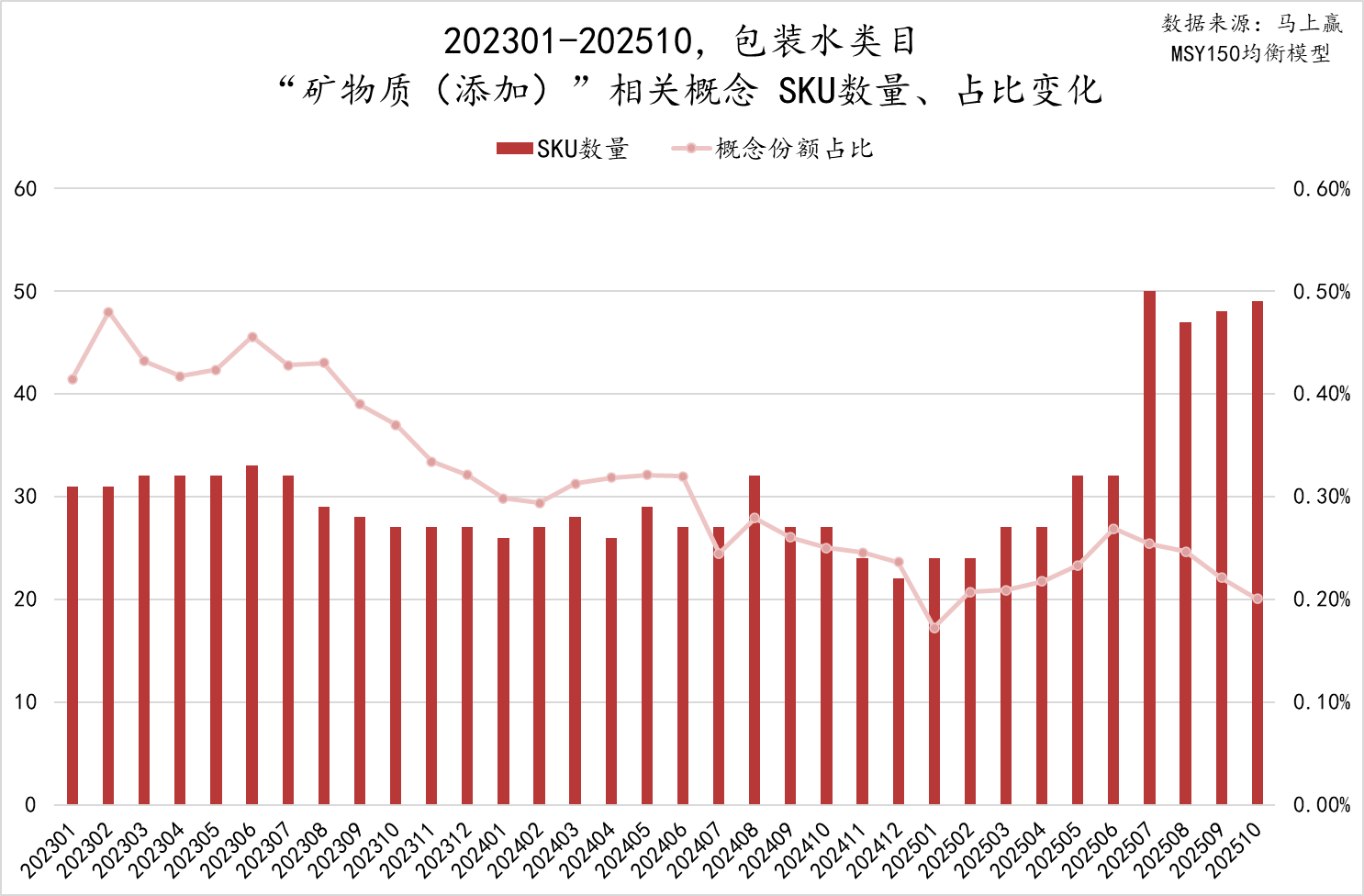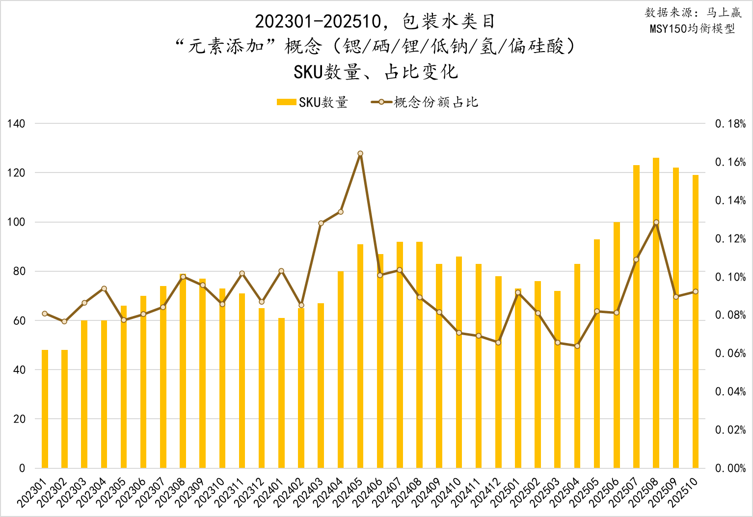 元素添加概念相关的产品,SKU数量呈现出较为明显的上升趋势,占比亦有略微上升的趋势。去年农夫山泉创始人在媒体活动上,以自身选择小小的带火了一把“锂水”,究其根本则是消费者对于针对性的功能性、功效型添加,依然有着相信与认可,随着功效化功能化产品的浪潮,未来该类型产品或将迎来更大的发展。