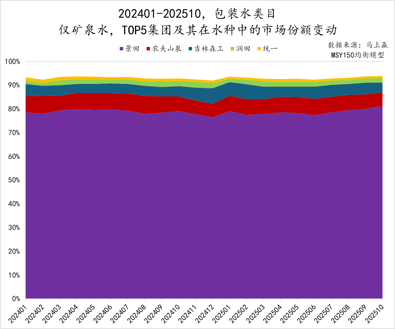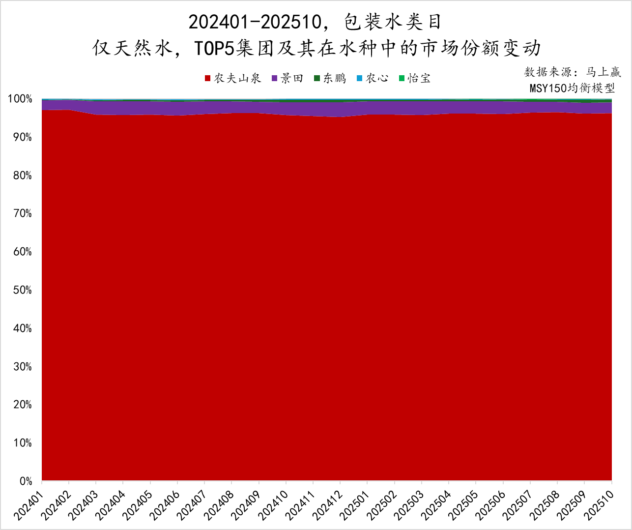 天然水市场呈现高度集中趋势,农夫山泉几乎占据了整个市场,市场份额超过95%,其次是景田,约占3%的市场份额,后续集团的份额则均<约1%。