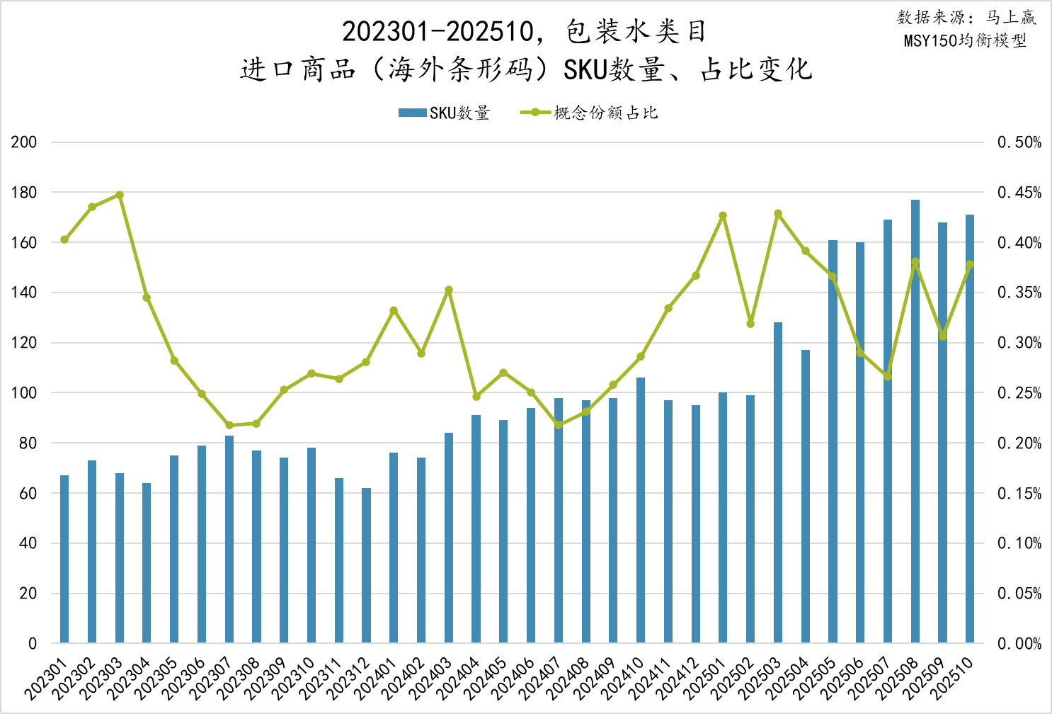 进口商品在包装水市场中的SKU数量呈现出上升趋势,但其概念占比一直在波动,整体变化不大,始终维持在约0.25%~0.45%之间波动。一方面,中国消费者在本土有更多、更好的选择,对于“依云”、“VOSS”等传统进口高端水也在不断的祛魅,另一方面,包装水类目整体的价格水平走势下,高于类目整体百毫升均价水平四至五倍,超高端定位的产品,也在被消费者不断质疑产品本身是否能够支撑其高昂的价格。