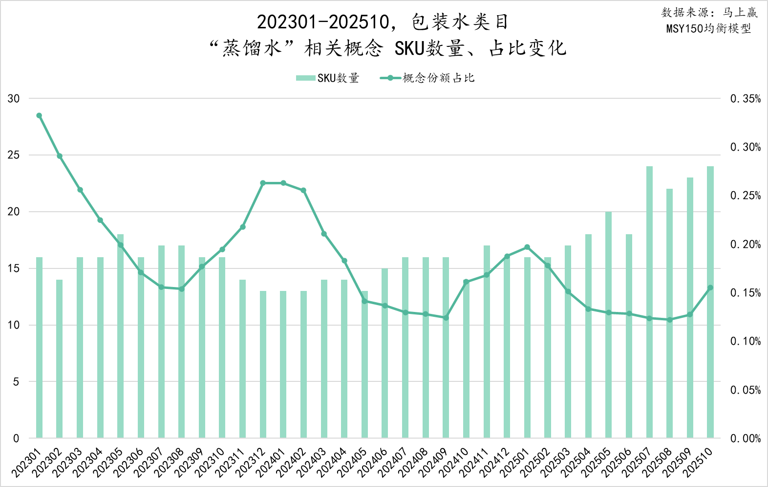 蒸馏水概念的SKU数量虽然有一定上升趋势,但其占比却呈现下降趋势。蒸馏水概念对于消费者来说不陌生,屈臣氏的蒸馏水产品系列也已经上市超过十年,但其他品牌、厂商跟进该概念的似乎不多,产品老化缺乏新的、吸引消费者的元素或许也是概念占比下滑的原因之一。
