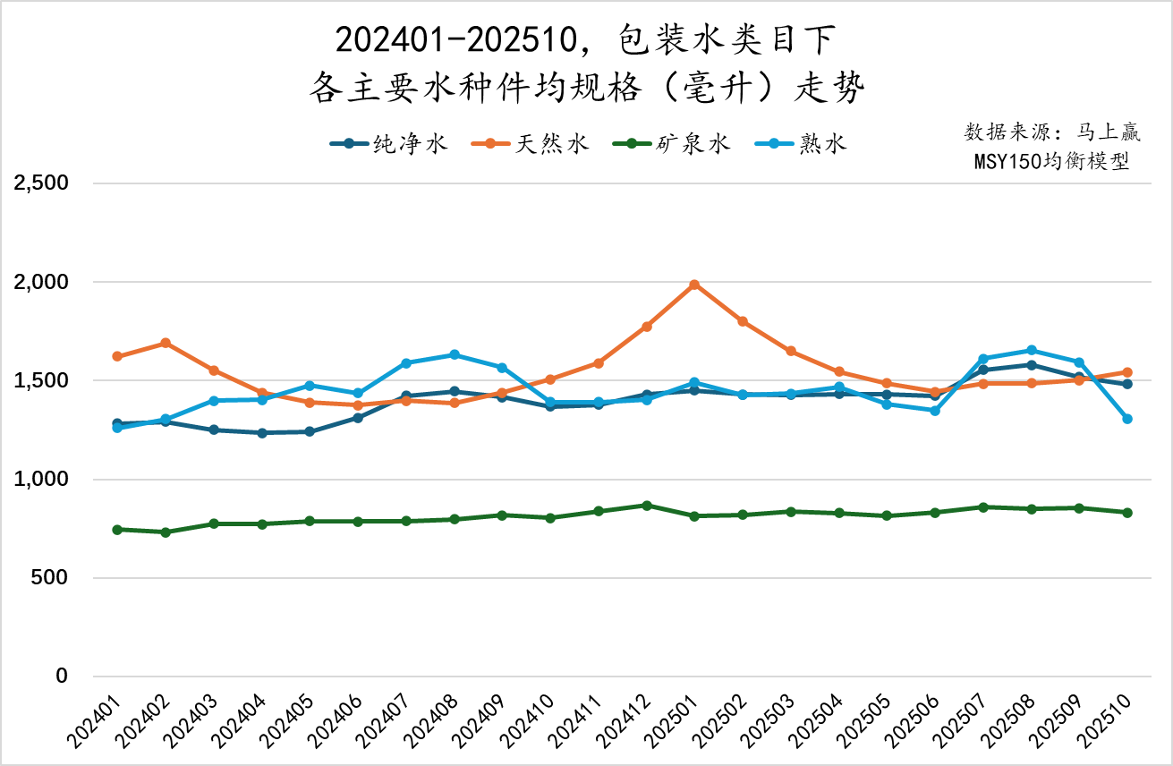 在不区分组合装/非组合装,不同水种的件平均规格上,矿泉水的平均规格始终显著低于其他三种水类,但呈现轻微的上行趋势,从2024年初的约750毫升,逐步上升到约850毫升。虽然矿泉水的规格相对较小,但这一增长趋势表明,随着市场需求的变化和消费者偏好的调整,矿泉水在规格上也在逐步适应市场的变化。