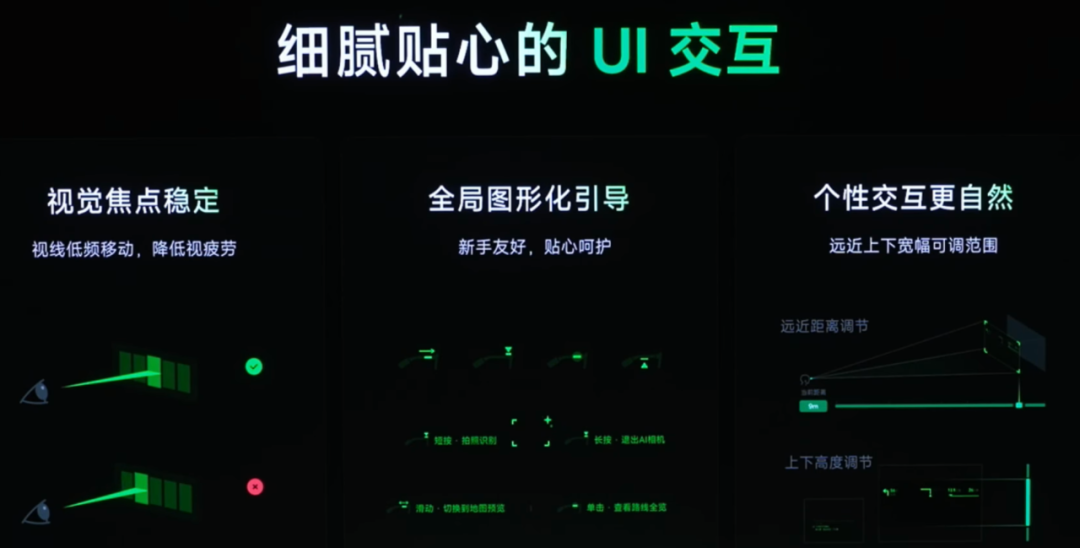 使用双目双光机,还不如升级到最早雷鸟X2开始用的JBD X-cube方案,RGB三个微显面板合光的全彩色光引擎。全彩色相比单绿色显示,对于不同场景下的信息提示,是真正的降维打击,UI设计、文字显示、图标,可以立即鲜活起来,更像是一个现代消费电子该有的。