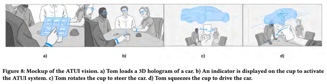 Meta 研究团队曾提出 ATUI 自适应可触用户界面(Adaptive Tangible User Interfaces)的愿景:不需要专门设计的硬件,而是通过识别环境中的物体及其特征,将这些物体临时转化为输入设备或控制器,从而为用户提供触觉反馈和物理操作感。比如我想旋转 3D 模型,只需用手旋转附近的杯子即可。