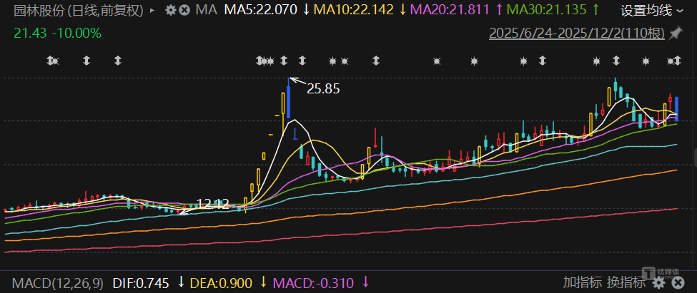 12月2日开盘,或受问询函的影响,园林股份股价开盘后快速下挫,最终跌停收盘,报收21.43元。同时,园林股份也在今天登上龙虎榜,营业部席位合计净卖出5086.41万元,这无疑也给此次跨界交易蒙上了一层阴影。![]()