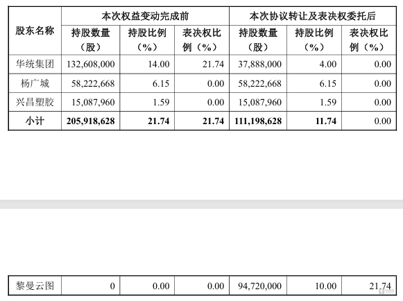 根据公告,此次易主方案主要为股权转让 表决权转让。华统集团将其持有的9472万股股份(占公司总股本10%)转让给黎曼云图,同时将3788.8万股股份(占公司总股本4%)对应的表决权委托给黎曼云图行使。