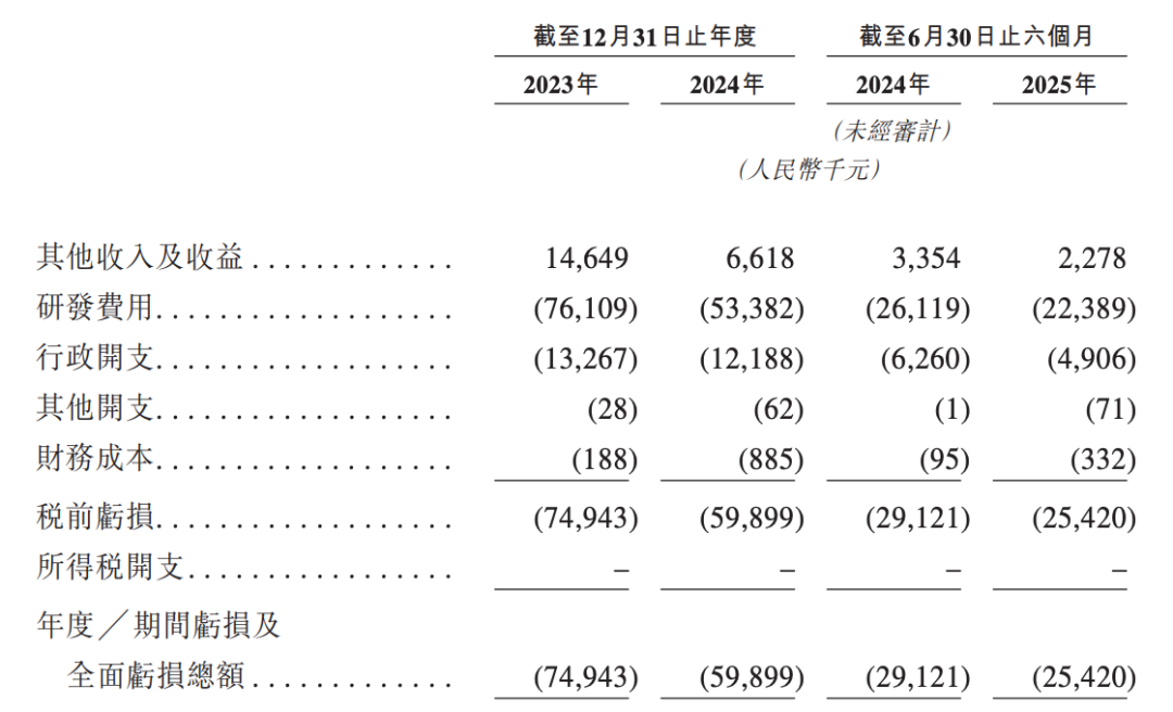 与此同时公司持续亏损。2023年全年亏损约7494万元,2024年由于研发开支缩减,亏损收窄至5989.9万元,截至2025年6月30日止六个月,公司净亏损2542万元,三年累计亏损超过1.6亿元。
