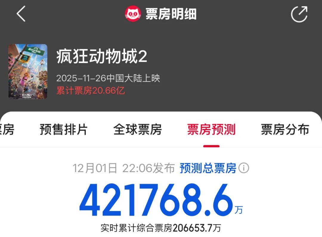 △ 截至11月25日,《疯狂动物城2》成为中国影史动画电影预售票房冠军