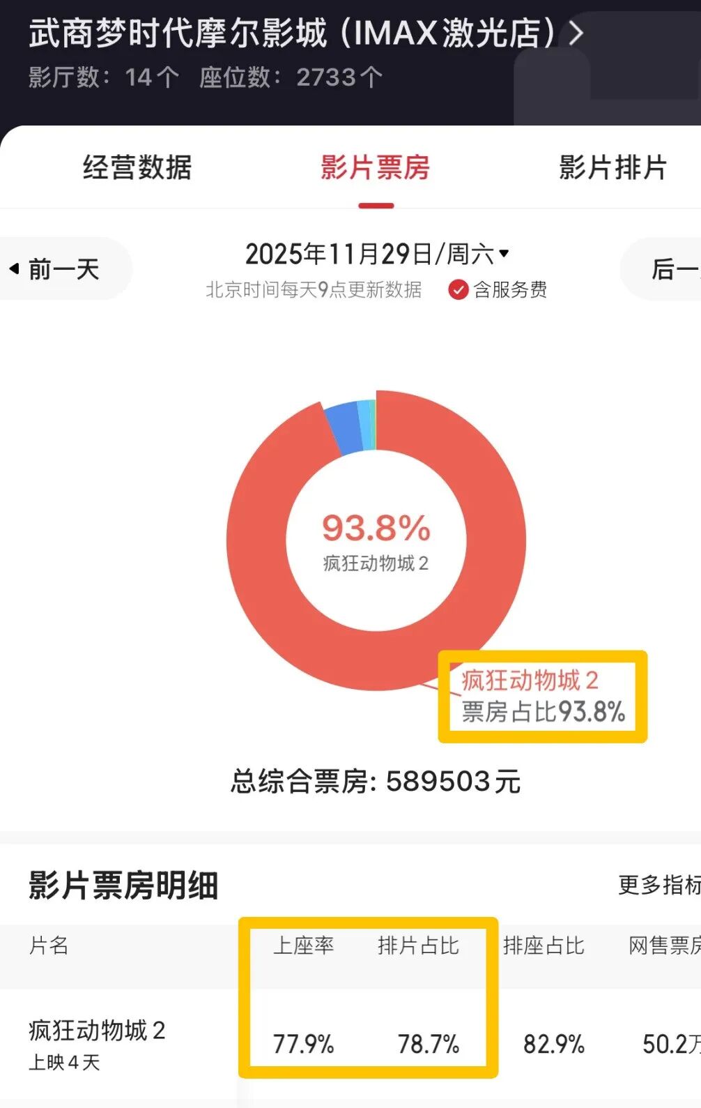 △ 武商梦时代摩尔影城上周六《疯狂动物城2》排片78.7%,上座率77.9%,单日单片票房55万