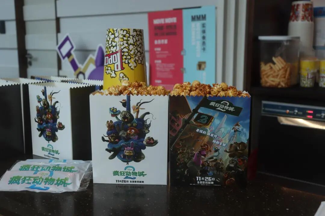 爆款效应不仅仅表现在票房上,影院同步上线了和《疯狂动物城2》配套的爆米花桶、可乐杯,以及IP联名的马克杯、钥匙扣、玩偶等系列周边,卖得特别好。