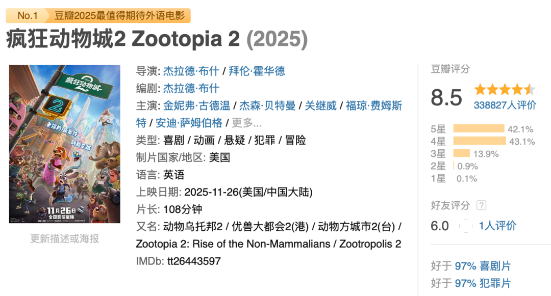 △ 截至目前,《疯狂动物城2》豆瓣评分8.5