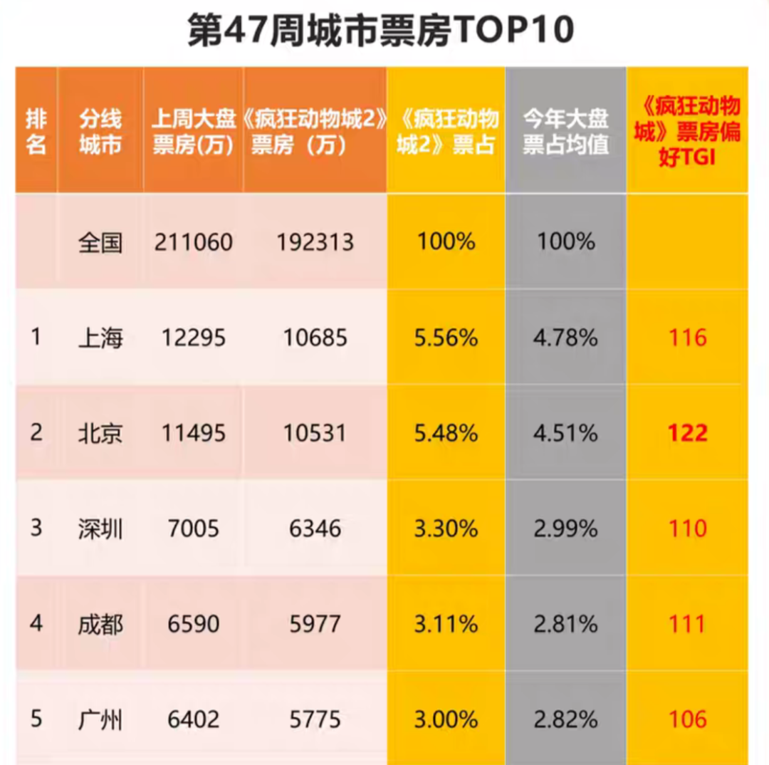 △ 上海、北京、深圳占据了《疯狂动物城2》票仓城市前三名