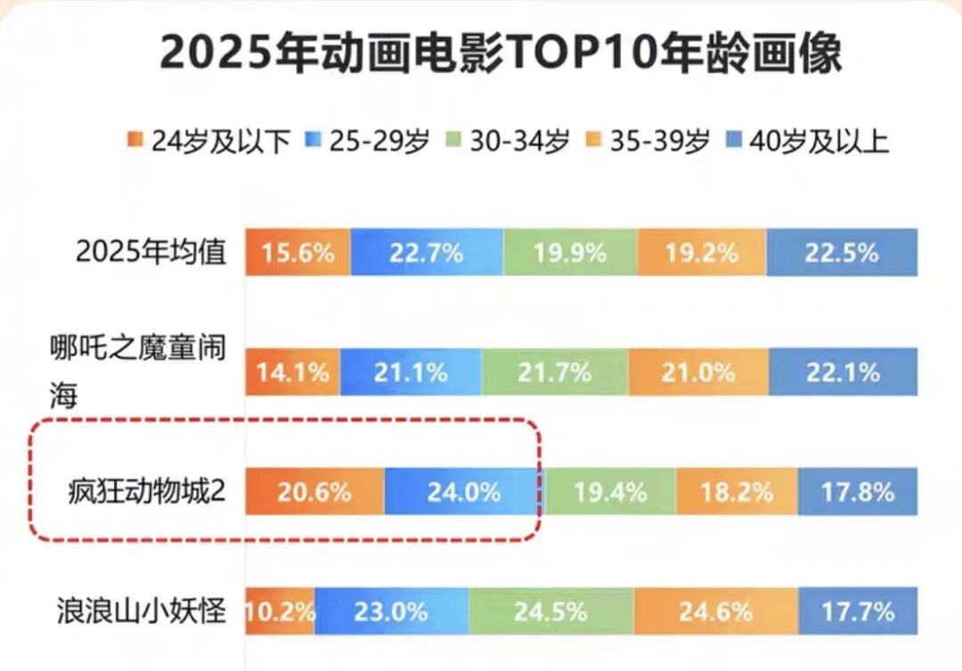 而2025年动画电影24岁及以下、25岁至29岁的观众平均占比分别为15.6%、22.7%,总占比38.3%。