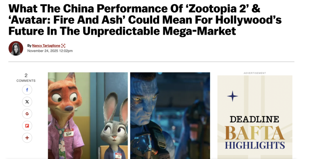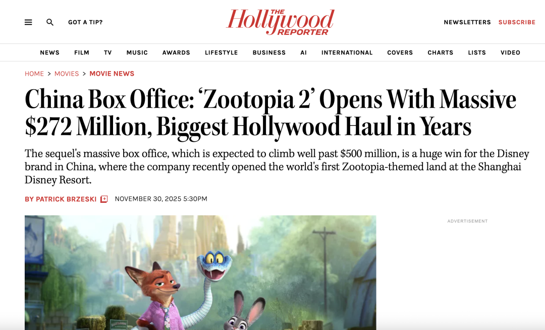 《好莱坞报道者》在分析《疯狂动物城2》在中国的票房表现时难掩兴奋之情。
